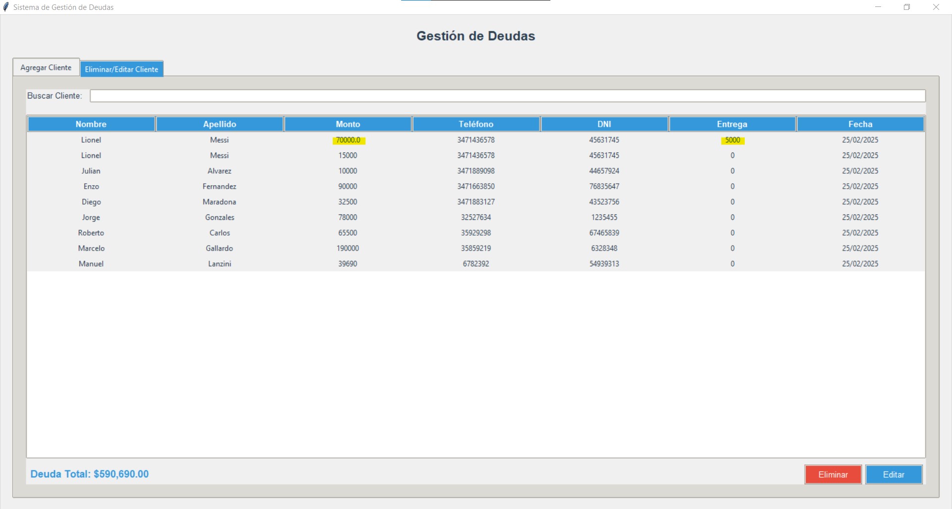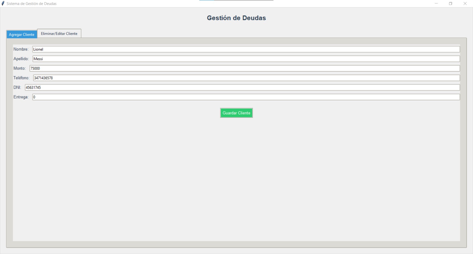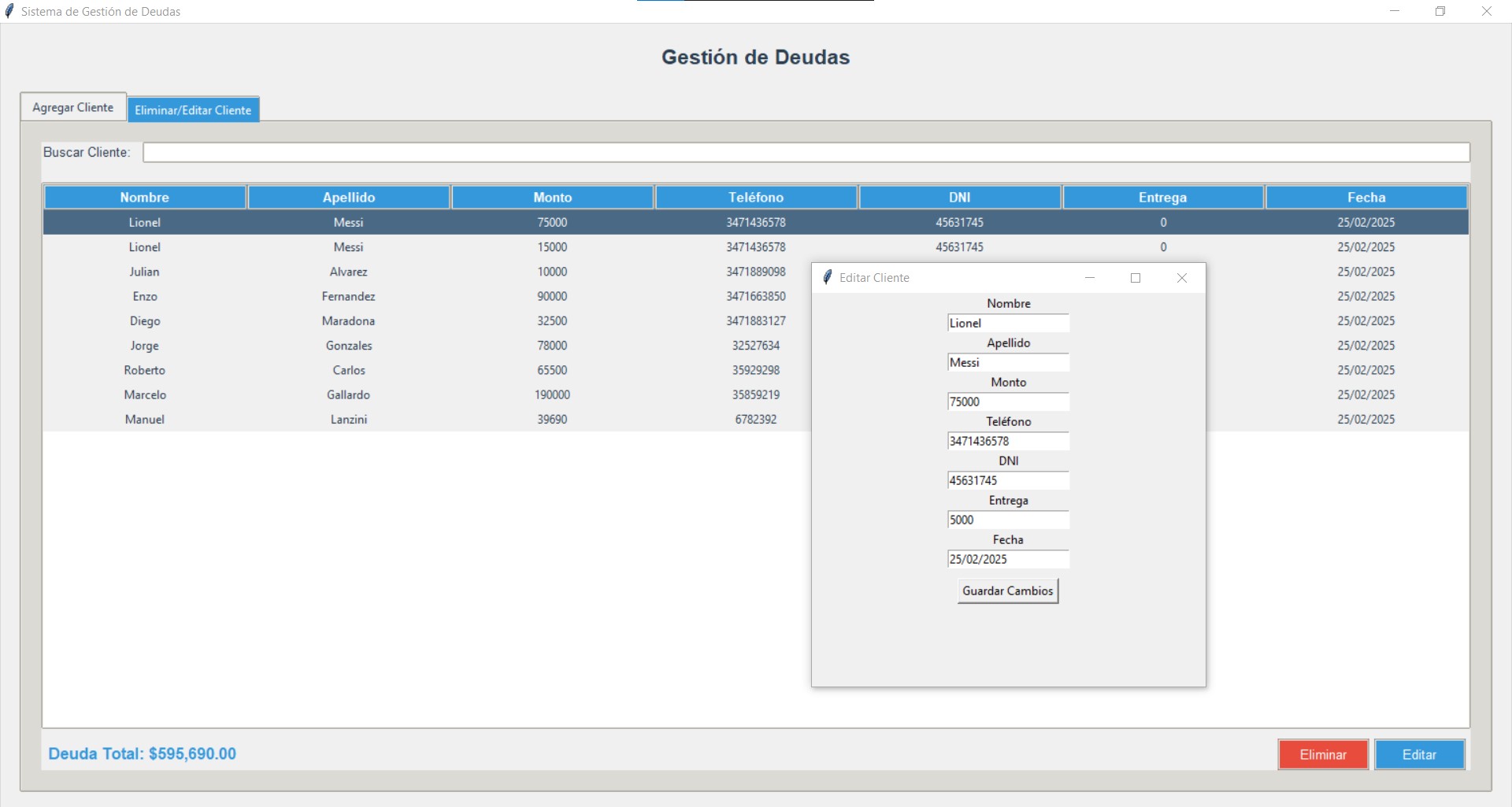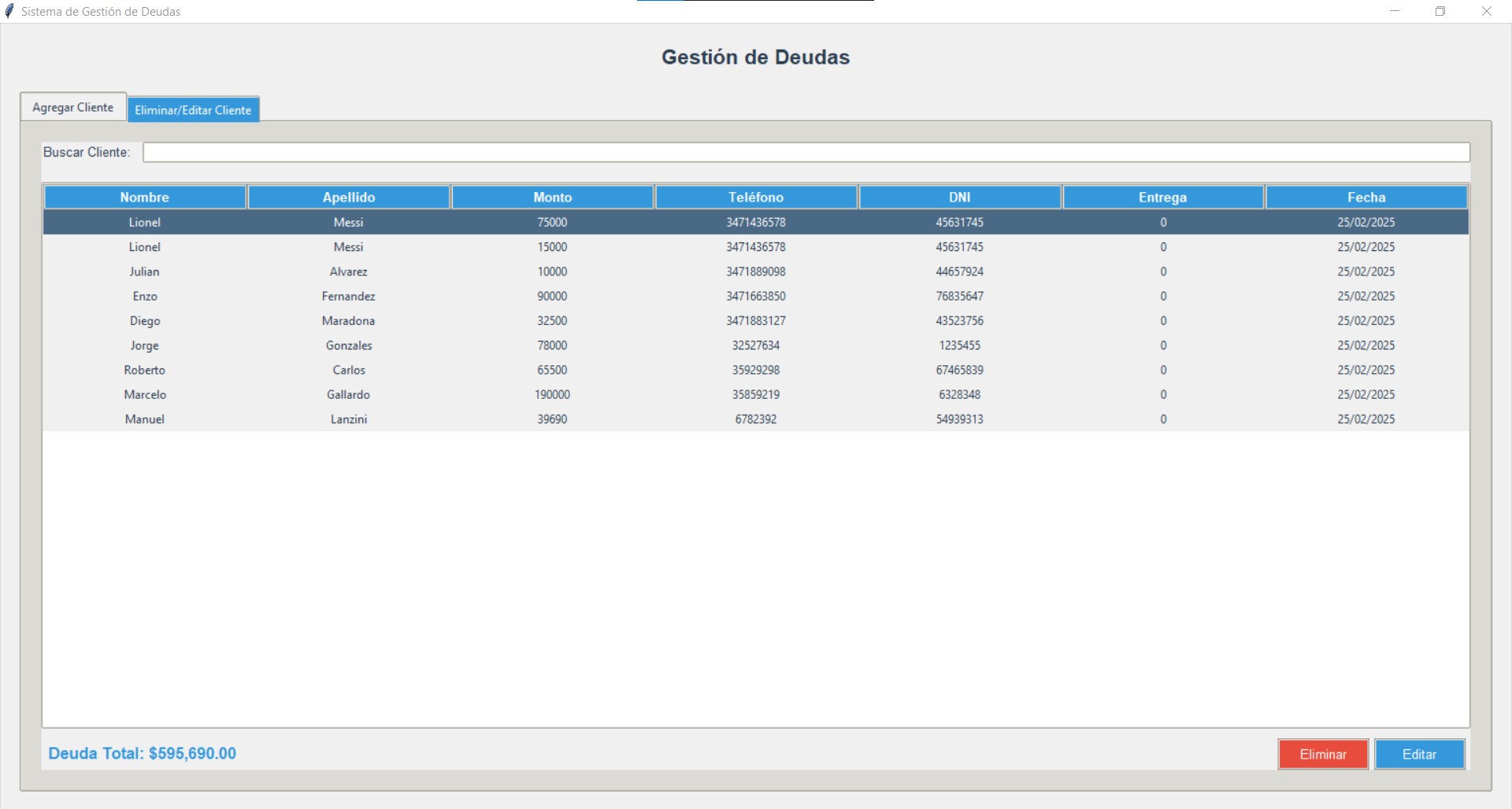 Software personalizado, un gestor de deudas desarrollado en Python que te permite registrar clientes, el monto de sus deudas, informacion personal y si el cliente hace una entrega de dinero, de forma sencilla y organizada. Tambien te dice el monto de la deuda total y se crea un excel con la misma tabla del software.